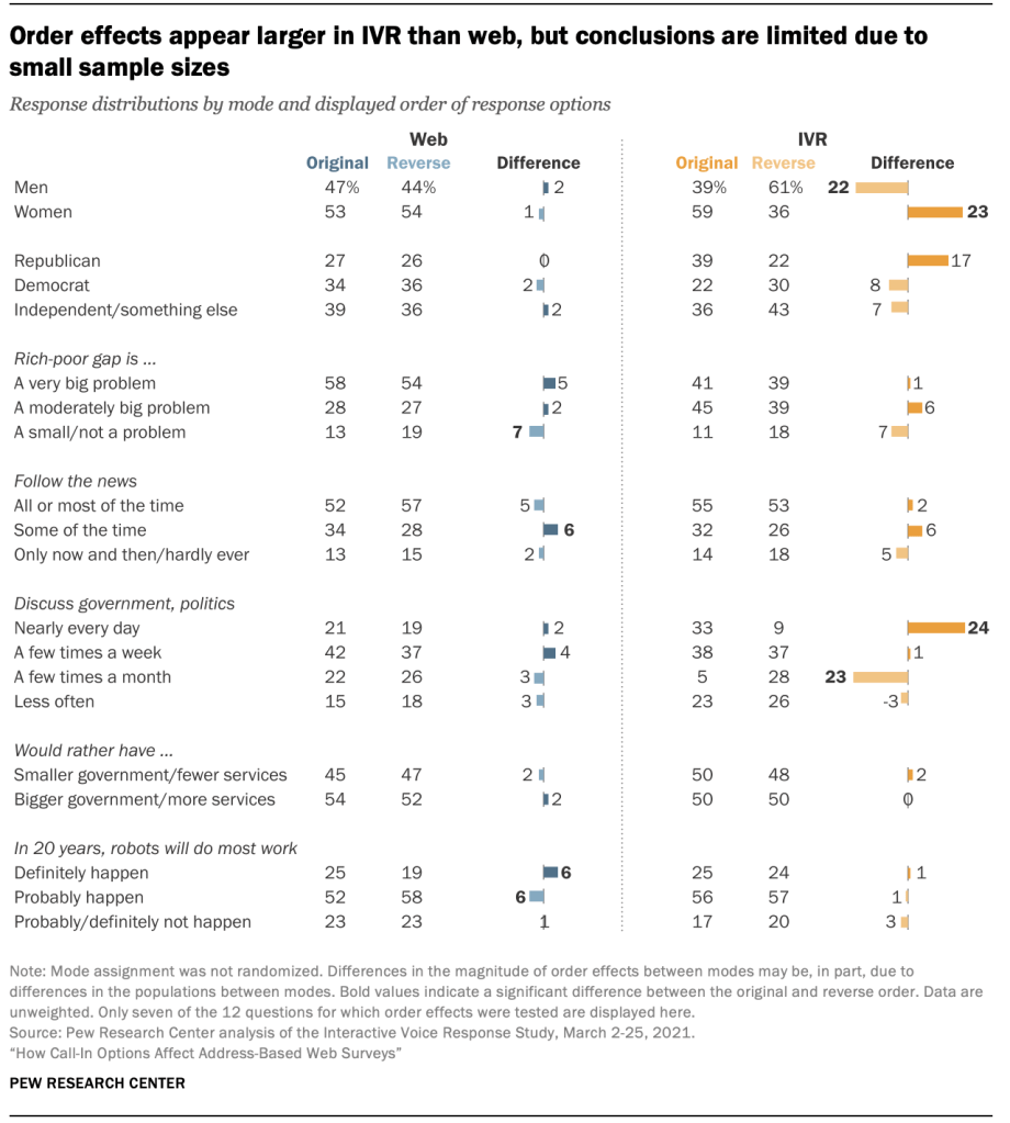 Some respondents are prone to order effects in self-administered modes. The order of the response options was randomized (first to last vs. last to first) for seven variables for both web and IVR2. Order effects were relatively consistent between modes for four of seven variables. However, three variables were susceptible to large (over 10 percentage points) order effects in IVR that were not observed among web responses: frequency with which individuals discuss government and politics, gender, and party identification. As noted before, the sample sizes for the IVR case counts are small (approximately 40 per group), so small changes in the distribution (regardless of the significance) can create large percentage point differences. IVR may also be more susceptible to satisficing later in the survey. Additional testing with larger samples, additional IVR questionnaire lengths, and placement of the questions is required before more conclusive inferences can be drawn. While order effects are less than ideal, randomization of the response order creates noise but can eliminate bias among these variables. Ultimately, even if the observed order effects are determined to be real, they can be accounted for and are not insurmountable.
