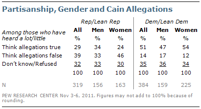 Of those who had heard about the allegations, about four-in-ten (39%) say that, from what they have read and heard, they think the allegations are true. Roughly a quarter (24%) say they think the claims are false, according to the latest weekly survey by the Pew Research Center for the People & the Press, conducted Nov. 3-6 among 1,005 adults. Another 36% say they do not know (31%) or refuse to answer (5%). The survey was completed before a Chicago woman went public with a new accusation against Cain on Monday.