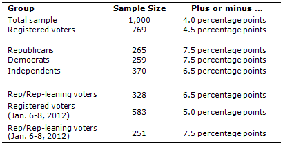 The analysis in this report is based on telephone interviews conducted January 5-8, 2012 among a national sample of 1,000 adults 18 years of age or older living in the continental United States (600 respondents were interviewed on a landline telephone, and 400 were interviewed on a cell phone, including 184 who had no landline telephone). The survey was conducted by interviewers at Princeton Data Source under the direction of Princeton Survey Research Associates International. A combination of landline and cell phone random digit dial samples were used; both samples were provided by Survey Sampling International. Interviews were conducted in English. Respondents in the landline sample were selected by randomly asking for the youngest adult male or female who is now at home. Interviews in the cell sample were conducted with the person who answered the phone, if that person was an adult 18 years of age or older. For detailed information about our survey methodology, see: https://www.pewresearch.org/politics/methodology/.