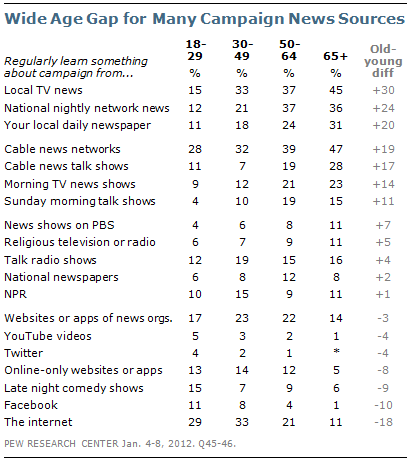 People age 65 and older are three times as likely as those younger than 30 to regularly learn about the election from local television news (45% versus 15%) and nightly network news (36% versus 12%), and the gap is almost as large for local daily newspapers (31% versus 11%).