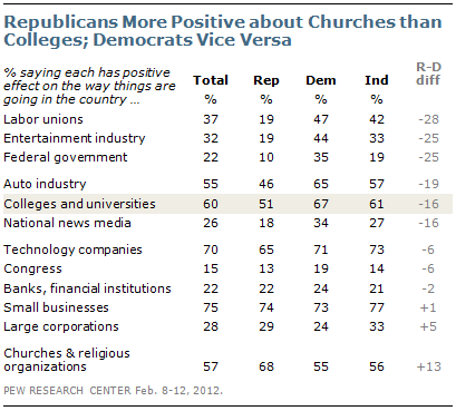 The survey released last month found substantial partisan differences in views of the effects of several institutions, aside from colleges and universities.