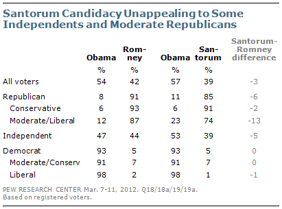 Some moderate and liberal Republican voters would also balk if Santorum becomes the nominee; 23% say they would vote for Obama, compared with 12% who would favor Obama over Romney.