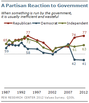 Overall assessments of the government’s performance remain quite negative. On the core question of whether the government is usually wasteful and inefficient, 59% now agree, little different than the 57% who said this in 2009. This is still less critical than views people expressed in the late 1980s and through most of the 1990s. In 1992, 70% said the government was usually inefficient and wasteful.