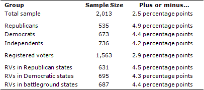 The combined landline and cell phone sample are weighted using an iterative technique that matches gender, age, education, race, Hispanic origin and region to parameters from the March 2011 Census Bureau’s Current Population Survey and population density to parameters from the Decennial Census. The sample also is weighted to match current patterns of telephone status, based on extrapolations from the 2011 National Health Interview Survey. The weighting procedure also accounts for the fact that respondents with both landline and cell phones have a greater probability of being included in the combined sample and adjusts for household size within the landline sample. Sampling errors and statistical tests of significance take into account the effect of weighting. The following table shows the sample sizes and the error attributable to sampling that would be expected at the 95% level of confidence for different groups in the survey: