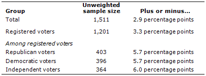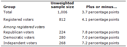 The combined landline and cell phone sample are weighted using an iterative technique that matches gender, age, education, race, Hispanic origin and region to parameters from the March 2011 Census Bureau’s Current Population Survey and population density to parameters from the Decennial Census. The sample also is weighted to match current patterns of telephone status, based on extrapolations from the 2011 National Health Interview Survey. The weighting procedure also accounts for the fact that respondents with both landline and cell phones have a greater probability of being included in the combined sample and adjusts for household size among respondents with a landline phone. Sampling errors and statistical tests of significance take into account the effect of weighting. The following table shows the unweighted sample sizes and the error attributable to sampling that would be expected at the 95% level of confidence for different groups in the survey: