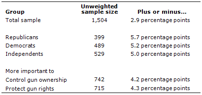 The combined landline and cell phone sample are weighted using an iterative technique that matches gender, age, education, race, Hispanic origin and nativity and region to parameters from the 2011 Census Bureau’s American Community Survey and population density to parameters from the Decennial Census. The sample also is weighted to match current patterns of telephone status and relative usage of landline and cell phones (for those with both), based on extrapolations from the 2012 National Health Interview Survey. The weighting procedure also accounts for the fact that respondents with both landline and cell phones have a greater probability of being included in the combined sample and adjusts for household size among respondents with a landline phone. Sampling errors and statistical tests of significance take into account the effect of weighting. The following table shows the unweighted sample sizes and the error attributable to sampling that would be expected at the 95% level of confidence for different groups in the survey: