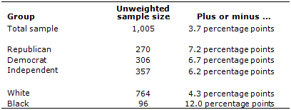 The combined landline and cell phone sample are weighted using an iterative technique that matches gender, age, education, race, Hispanic origin and region to parameters from the 2011 Census Bureau’s American Community Survey and population density to parameters from the Decennial Census. The sample also is weighted to match current patterns of telephone status, based on extrapolations from the 2012 National Health Interview Survey. The weighting procedure also accounts for the fact that respondents with both landline and cell phones have a greater probability of being included in the combined sample and adjusts for household size among respondents with a landline phone. Sampling errors and statistical tests of significance take into account the effect of weighting. The following table shows the unweighted sample sizes and the error attributable to sampling that would be expected at the 95% level of confidence for different groups in the survey: