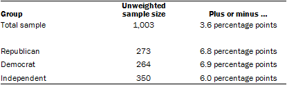 The combined landline and cell phone sample are weighted using an iterative technique that matches gender, age, education, race, Hispanic origin and region to parameters from the 2012 Census Bureau’s American Community Survey and population density to parameters from the Decennial Census. The sample also is weighted to match current patterns of telephone status (landline only, cell phone only, or both landline and cell phone), based on extrapolations from the 2014 National Health Interview Survey. The weighting procedure also accounts for the fact that respondents with both landline and cell phones have a greater probability of being included in the combined sample and adjusts for household size among respondents with a landline phone. The margins of error reported and statistical tests of significance are adjusted to account for the survey’s design effect, a measure of how much efficiency is lost from the weighting procedures.