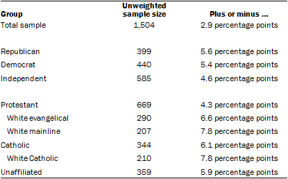The following table shows the unweighted sample sizes and the error attributable to sampling that would be expected at the 95% level of confidence for different groups in the survey: