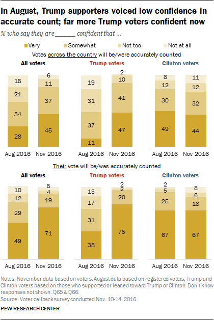 The same pattern exists in confidence that one’s own vote was accurately counted: 75% of Trump voters now say they are “very” confident their own vote was counted accurately, double the share of Trump supporters who said in August that they were very confident their vote would be counted accurately in the November election. By comparison, the 67% of Clinton voters who now say they are very confident their vote was counted accurately is identical to the share of Clinton supporters who expected that their votes would be counted accurately in August.
