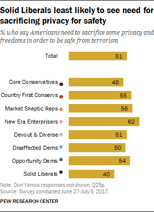 only typology group in which a majority (58%) says Americans do not need to sacrifice privacy for safety from terrorism; 40% say Americans need to sacrifice some privacy and freedoms to be safe.