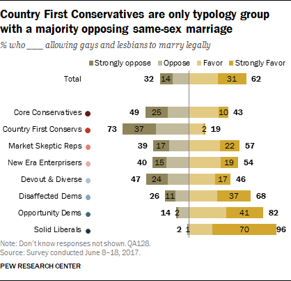 Country First Conservatives are the only typology group in which a majority (73%) says it opposes same-sex marriage (including 37% who are strongly opposed). Core Conservatives are about equally likely to favor (43%) as to oppose (49%) same-sex marriage. Majorities of Market Skeptic Republicans (57%) and New Era