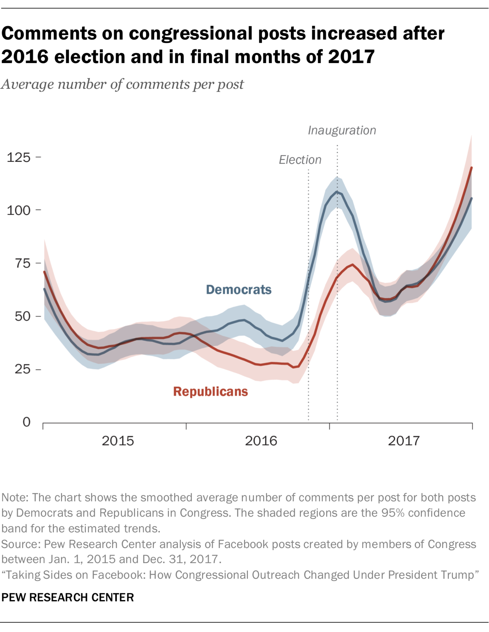 In the wake of the 2016 election, legislators’ Facebook audiences became much more likely to engage online by posting comments. Across both parties, the average number of comments per post increased more than 200%, comparing the time period before the 2016 election with all posts created afterward.