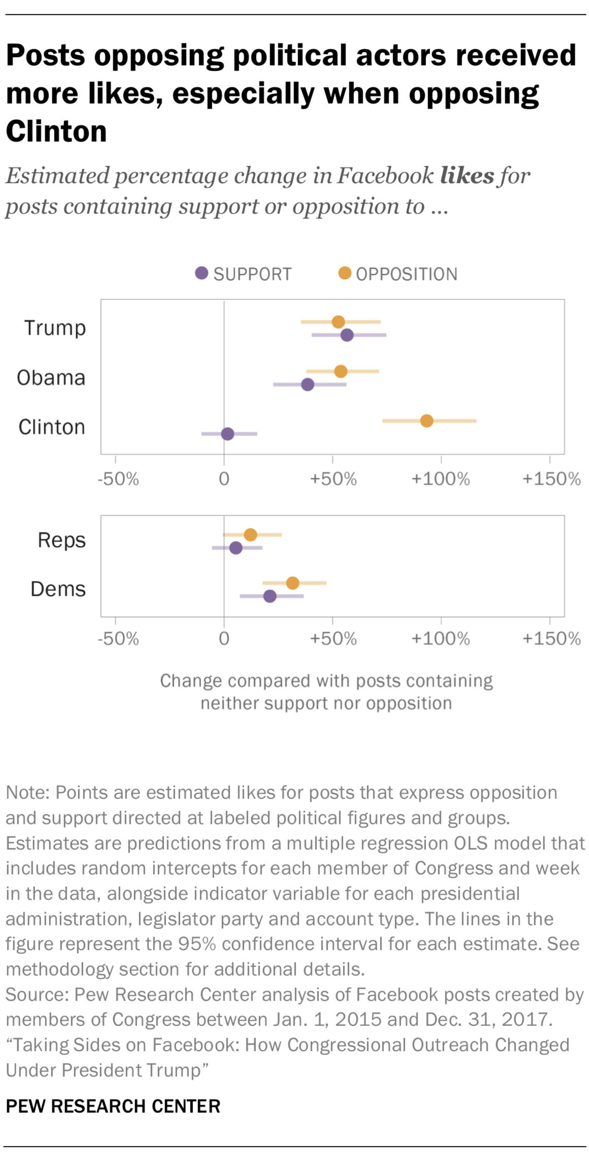 This analysis uses statistical models to examine how the presence of support or opposition in a Facebook post can affect the number of likes, comments and shares it receives. The models help account for other factors that could impact that post’s engagement, such as the number of followers a given post’s author has and when it was posted. See methodology section for additional details. All of the reported results are based on the entire three-year time frame.
