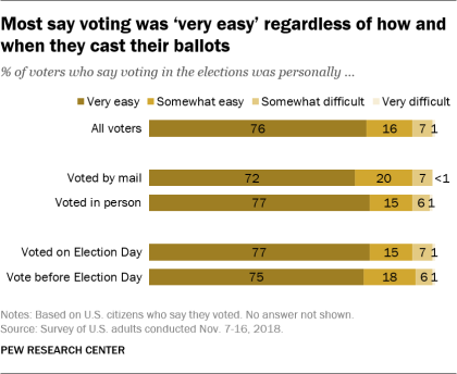 Voters who cast their vote before Election Day are just as likely as those who voted on Election Day to say the experience was easy: 75% of early voters say it was very easy for them compared with 77% of those who turned out on Election Day.