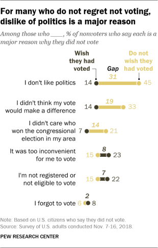 And while a third of nonvoters who do not wish they had voted (33%) say not believing their vote would make a difference was a major reason why they did not vote, only 14% of nonvoters who wish they voted say the same.
