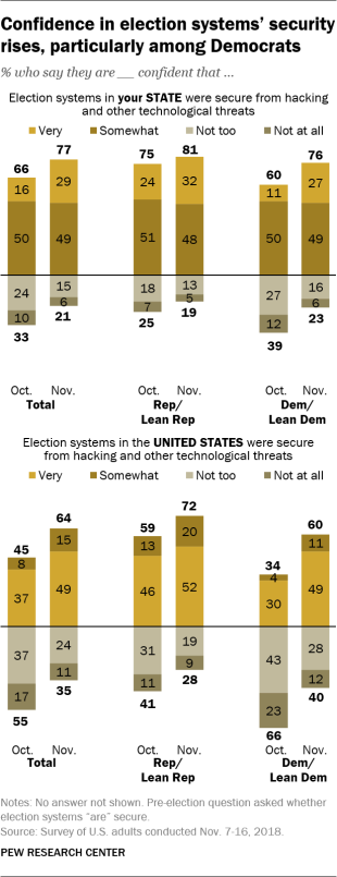 Among the 66% of Americans who before the elections said they were very or somewhat confident that state election systems were secure, nearly nine-in-ten (88%) continue to express confidence, while a 60% majority of those who were not too or not at all confident in the security of these systems before the elections now say they are at least somewhat confident they were secure.