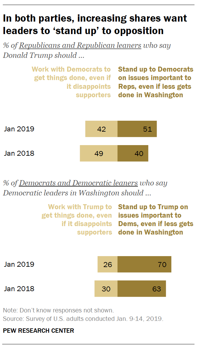 Most Democrats want party leaders to “stand up” to Trump. As was the case a year ago, a majority of Democrats (70%) want their party’s leaders to “stand up” to Trump this year, even if it means less gets done in Washington; just 26% want them to try as best they can to work with Trump, even if it means disappointing some groups of Democratic supporters. A year ago, 63% of Democrats wanted their party’s leaders to stand up to the president. Among Republicans, the share saying Trump should stand up to Democrats has increased from 40% a year ago to 51% currently.