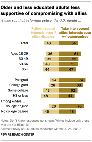 Younger and more educated Americans are more supportive of the U.S. compromising with its allies than older adults and those with less education.