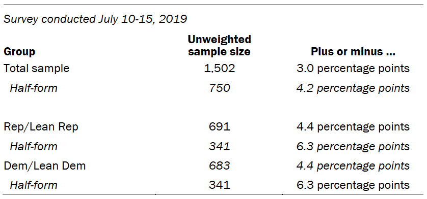 The analysis in this report is based on telephone interviews conducted July 10-15, 2019, among a national sample of 1,502 adults, 18 years of age or older, living in all 50 U.S. states and the District of Columbia (302 respondents were interviewed on a landline telephone, and 1,200 were interviewed on a cellphone, including 807 who had no landline telephone). The survey was conducted by interviewers under the direction of Abt Associates. A combination of landline and cellphone random-digit-dial samples were used; both samples were provided by Survey Sampling International LLC. Interviews were conducted in English and Spanish. Respondents in the landline sample were selected by randomly asking for the youngest adult male or female who is now at home. Interviews in the cell sample were conducted with the person who answered the phone, if that person was an adult 18 years of age or older. The weighting procedure corrected for the different sampling rates. For detailed information about our survey methodology, see http://www.pewresearch.org/methodology/u-s-survey-research/.
