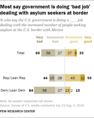 Nearly two-thirds of Americans (65%) say the federal government is doing a very bad (38%) or somewhat bad (27%) job dealing with the increased number of people seeking asylum at the U.S.-Mexico border; just 33% say the government is doing a good job, according to the new survey by Pew Research Center conducted July 22-Aug. 4 among 4,175 adults.