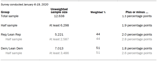 Data in this report are drawn from the panel wave conducted January 6 to January 19, 2020. A total of 12,638 panelists responded out of 15,463 who were sampled, for a response rate of 82%. This does not include nine panelists who were removed from the data due to extremely high rates of refusal or straightlining. The cumulative response rate accounting for nonresponse to the recruitment surveys and attrition is 5.3%. The break-off rate among panelists who logged onto the survey and completed at least one item is 1%. The margin of sampling error for the full sample of 12,638 respondents is plus or minus 1.3 percentage points.