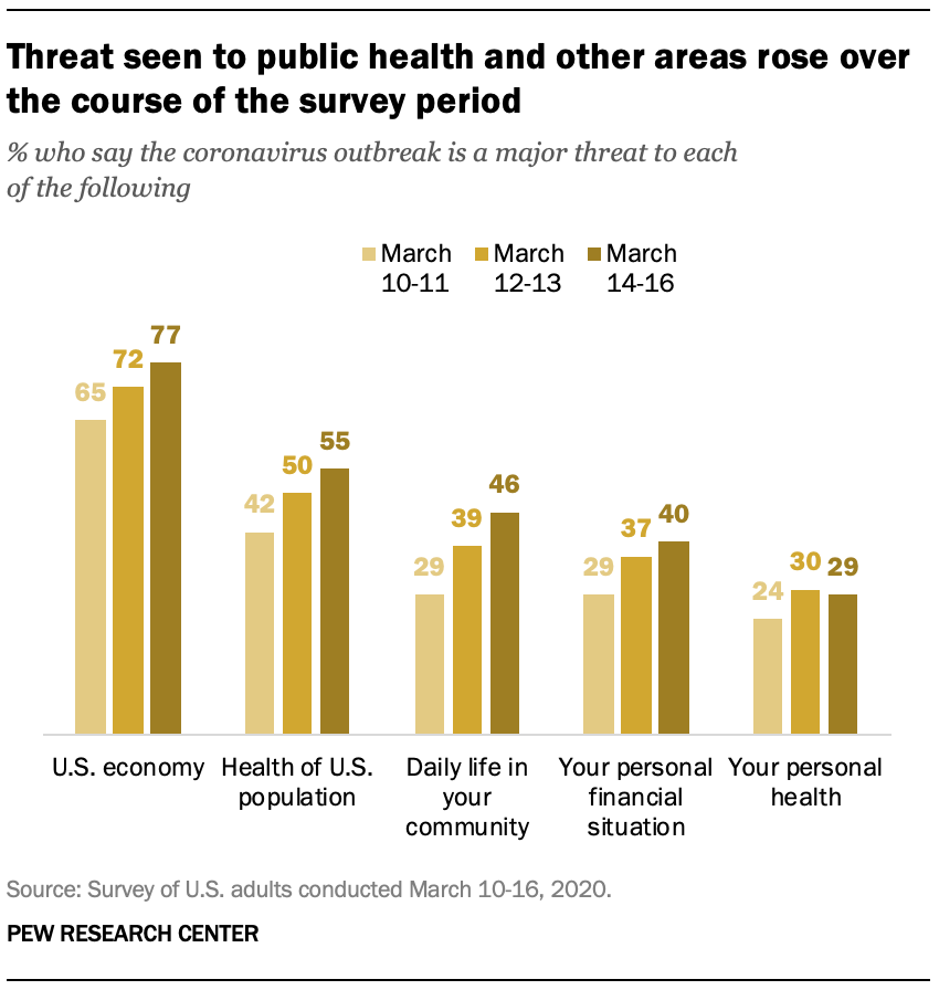 Underscoring the rapidly changing nature of this crisis, the shares of Americans who say the COVID-19 outbreak is a major threat to the economy and other aspects of life increased substantially over the past week. For example, in interviews conducted March 10-11, 42% of the public said the coronavirus was a major threat to the health of the U.S. population; in interviews conducted March 14-16, 55% say it is a major threat to the nation’s overall health.