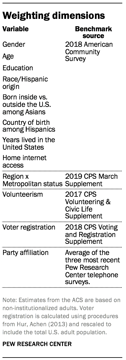 The ATP data was weighted in a multistep process that begins with a base weight incorporating the respondents’ original selection probability. The next step in the weighting uses an iterative technique that aligns the sample to population benchmarks on the dimensions listed in the accompanying table.