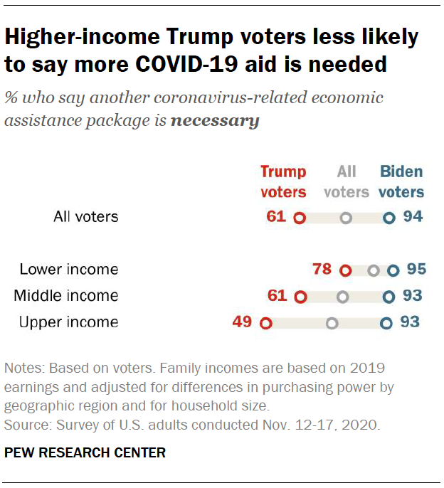 However, the relationship between household income and support for a second major relief bill is only seen among Trump voters. About half (49%) of Trump voters in upper-income households say that another relief bill is necessary; larger shares of Trump voters in middle- (61%) and lower-income households (78%) say an additional aid package is needed.