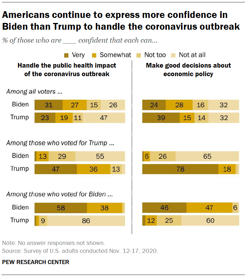 In addition, while 58% of Biden voters are very confident in his ability to handle the coronavirus, fewer Trump voters (47%) are very confident in the president.