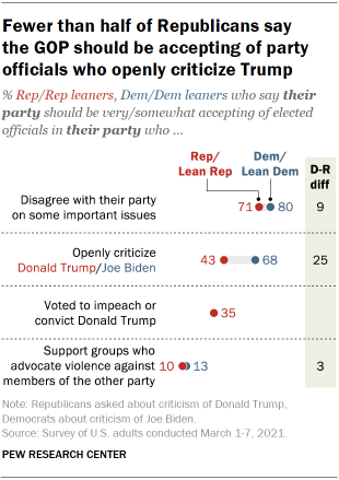 There are more striking differences in how partisans view criticism of their party’s top leaders – Biden and Trump. About two-thirds of Democrats (68%) say the Democratic Party should be accepting of Democrats who openly criticize Biden. Among Republicans, fewer than half (43%) say the GOP should be accepting of officials who openly criticize Trump; 56% say the party should be not too accepting or not at all accepting of such an official.