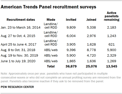 In August 2018, the ATP switched from telephone to address-based recruitment. Invitations were sent to a random, address-based sample of households selected from the U.S. Postal Service’s Delivery Sequence File. Two additional recruitments were conducted using the same method in 2019 and 2020, respectively. Across these three address-based recruitments, a total of 17,161 adults were invited to join the ATP, of whom 15,134 (88%) agreed to join the panel and completed an initial profile survey. In each household, the adult with the next birthday was asked to go online to complete a survey, at the end of which they were invited to join the panel. Of the 25,076 individuals who have ever joined the ATP, 13,545 remained active panelists and continued to receive survey invitations at the time this survey was conducted.