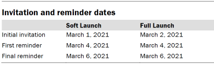 On March 1 and March 2, invitations were sent out in two separate launches: Soft Launch and Full Launch. Sixty panelists were included in the soft launch, which began with an initial invitation sent on March 1, 2021. The ATP panelists chosen for the initial soft launch were known responders who had completed previous ATP surveys within one day of receiving their invitation. All remaining English- and Spanish-speaking panelists were included in the full launch and were sent an invitation on March 2, 2021.