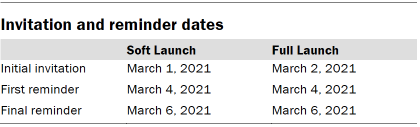On March 1 and March 2, invitations were sent out in two separate launches: Soft Launch and Full Launch. Sixty panelists were included in the soft launch, which began with an initial invitation sent on March 1, 2021. The ATP panelists chosen for the initial soft launch were known responders who had completed previous ATP surveys within one day of receiving their invitation. All remaining English- and Spanish-speaking panelists were included in the full launch and were sent an invitation on March 2, 2021.