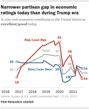 Partisan views of the economy have shifted since Joe Biden became president. Today, Democrats hold more positive ratings of the economy than do Republicans – a reversal from when Trump was in office.