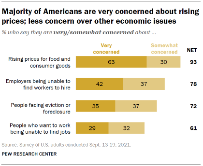 While substantial shares of Americans express concern about several economic issues – including a shortage of workers and people facing eviction and foreclosure – more say they are very concerned about rising prices than say this about other economic problems.