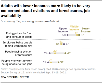 However, lower-income adults are more likely than middle- and upper-income adults to be very concerned about people facing eviction or foreclosure (47%) and about people who want jobs being unable to find work (37%). Fewer than a quarter of upper-income adults are very concerned about either economic issue.