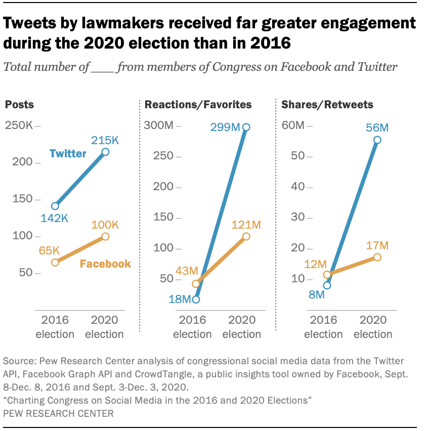 The 2020 election occurred in a cultural and political climate that was vastly different than that of the 2016 race. The unique nature of each election cycle was also visible in the ways members of Congress used Facebook and Twitter to engage with the public in the months before and after Election Day. Most obviously, the 2020 election was much more online than the preceding presidential cycle. Lawmakers shared tens of thousands more posts – and received orders of magnitude more engagement from other social media users – than was the case in 2016.