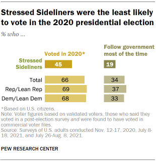 Fewer than half (45%) of Stressed Sideliners who are adult citizens voted in the 2020 presidential election. This turnout rate was 10 percentage points lower than the next lowest group (Ambivalent Right, at 55%) and 21 points lower than among all adult citizens. Few in this group express much interest in politics more generally: Just 19% say they follow what’s going on in government and public affairs most of the time.