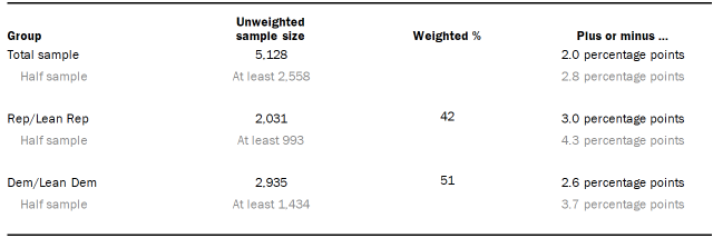 Sample sizes and sampling errors for other subgroups are available upon request. In addition to sampling error, one should bear in mind that question wording and practical difficulties in conducting surveys can introduce error or bias into the findings of opinion polls.