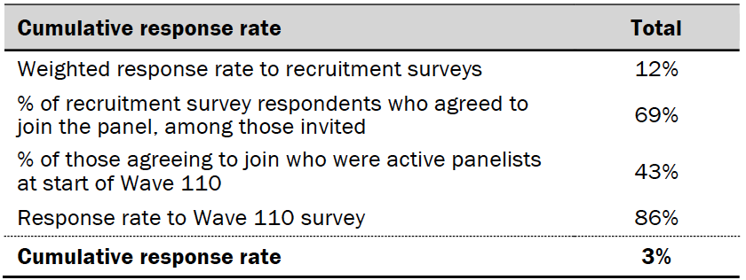 Among the panelists who completed the survey, this weight is then calibrated again to align with the population benchmarks identified in the accompanying table and trimmed at the 1st and 99th percentiles to reduce the loss in precision stemming from variance in the weights. Sampling errors and tests of statistical significance take into account the effect of weighting.