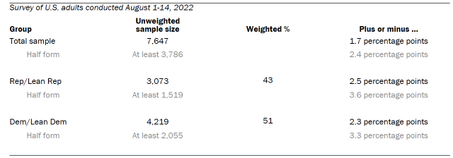 Data in this report is drawn from the panel wave conducted from Aug. 1 to Aug. 14 and included oversamples of Hispanic, Asian and Black adults, as well as 18-29 year old Republicans and Republican leaning independents in order to provide more precise estimates of the opinions and experiences of these smaller demographic subgroups. These oversampled groups are weighted back to reflect their correct proportions in the population. A total of 7,647 panelists responded out of 13,221 who were sampled, for a response rate of 65%. This included 6,025 respondents from the ATP and an oversample of 1,622 Hispanic respondents from Ipsos’ KnowledgePanel. The cumulative response rate accounting for nonresponse to the recruitment surveys and attrition is 3%. The break-off rate among panelists who logged on to the survey and completed at least one item is 2%. The margin of sampling error for the full sample of 7,647 respondents is plus or minus 1.7 percentage points.