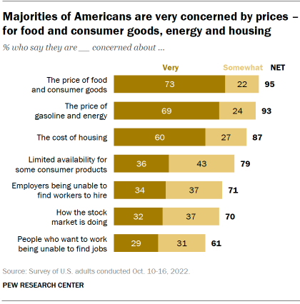 The survey finds that inflation remains the dominant economic concern for Americans. In fact, the three top concerns, among seven items included, relate to prices – for food and consumer goods (73% are very concerned about this), gasoline and energy (69%) and the cost of housing (60%).