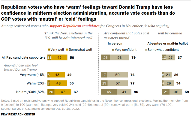 Republican voters who feel warmly toward Trump also are much less confident than those with neutral or cold feelings to express confidence that absentee or mail ballots will be counted as voters intend. And while 45% of Republican voters with neutral or cold feelings toward Trump are very confident that votes cast in person at polling places will be counted accurately, fewer than half of those with warm (19%) or very warm (17%) feelings toward Trump say the same.