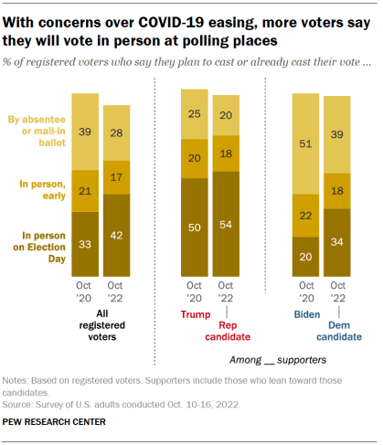 More voters are voting in person. Voting in the 2020 presidential election was severely impacted by the coronavirus outbreak. In October of that year, just a third of registered voters said they expected to vote in person on Election Day. This year, 42% of voters say they expect to vote in person on Election Day, with virtually all of the increase coming among Democratic voters.