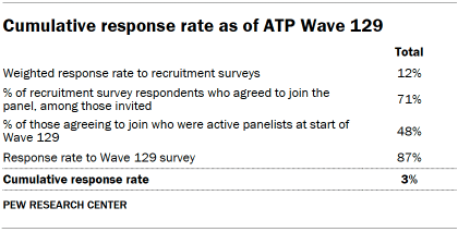The ATP data is weighted in a multistep process that accounts for multiple stages of sampling and nonresponse that occur at different points in the survey process. First, each panelist begins with a base weight that reflects their probability of selection for their initial recruitment survey. These weights are then rescaled and adjusted to account for changes in the design of ATP recruitment surveys from year to year. Finally, the weights are calibrated to align with the population benchmarks in the accompanying table to correct for nonresponse to recruitment surveys and panel attrition. If only a subsample of panelists was invited to participate in the wave, this weight is adjusted to account for any differential probabilities of selection.