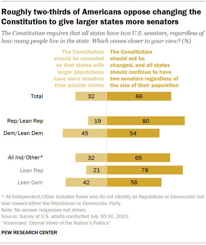 When it comes to the Senate, 66% of adults say that the method of determining representation in the upper chamber should not be changed, and all states should continue to have two senators regardless of population size. Roughly half as many (32%) say that the Constitution should be amended so that states with larger populations have more senators than smaller states.