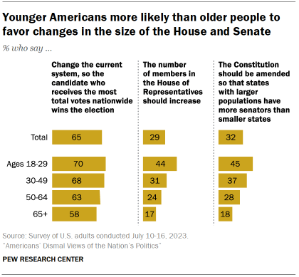 Younger adults are more likely than older adults to favor a popular vote for president, an expansion of the House of Representatives and a change to the way representation in the Senate is apportioned.