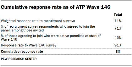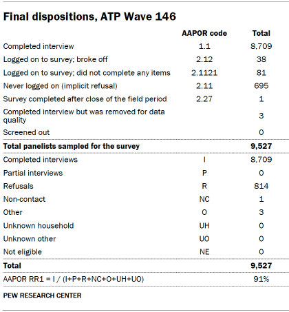 To ensure high-quality data, the Center’s researchers performed data quality checks to identify any respondents showing clear patterns of satisficing. This includes checking for whether respondents left questions blank at very high rates or always selected the first or last answer presented. As a result of this checking, three ATP respondents were removed from the survey dataset prior to weighting and analysis.