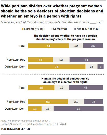Republicans are about three times as likely as Democrats to say “an embryo is a person with rights” describes their views extremely or very well (53% vs. 18%). In turn, Democrats (66%) are far more likely than Republicans (25%) to say it describes their views not too or not at all well.